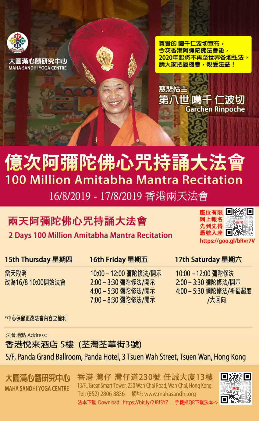數年前,為了便利信眾親近、修學彌陀法門,噶千仁波切特別親自編寫了言簡意賅的新版極樂修法儀軌,過去幾年更常於新加坡、台灣等地舉辦世界同步的億遍彌陀心咒共修法會,大開極樂法筵,令信眾普植善根。此次仁波切慈悲應允,首度在港舉辦此殊勝法會,至盼十方有識者共襄盛舉。