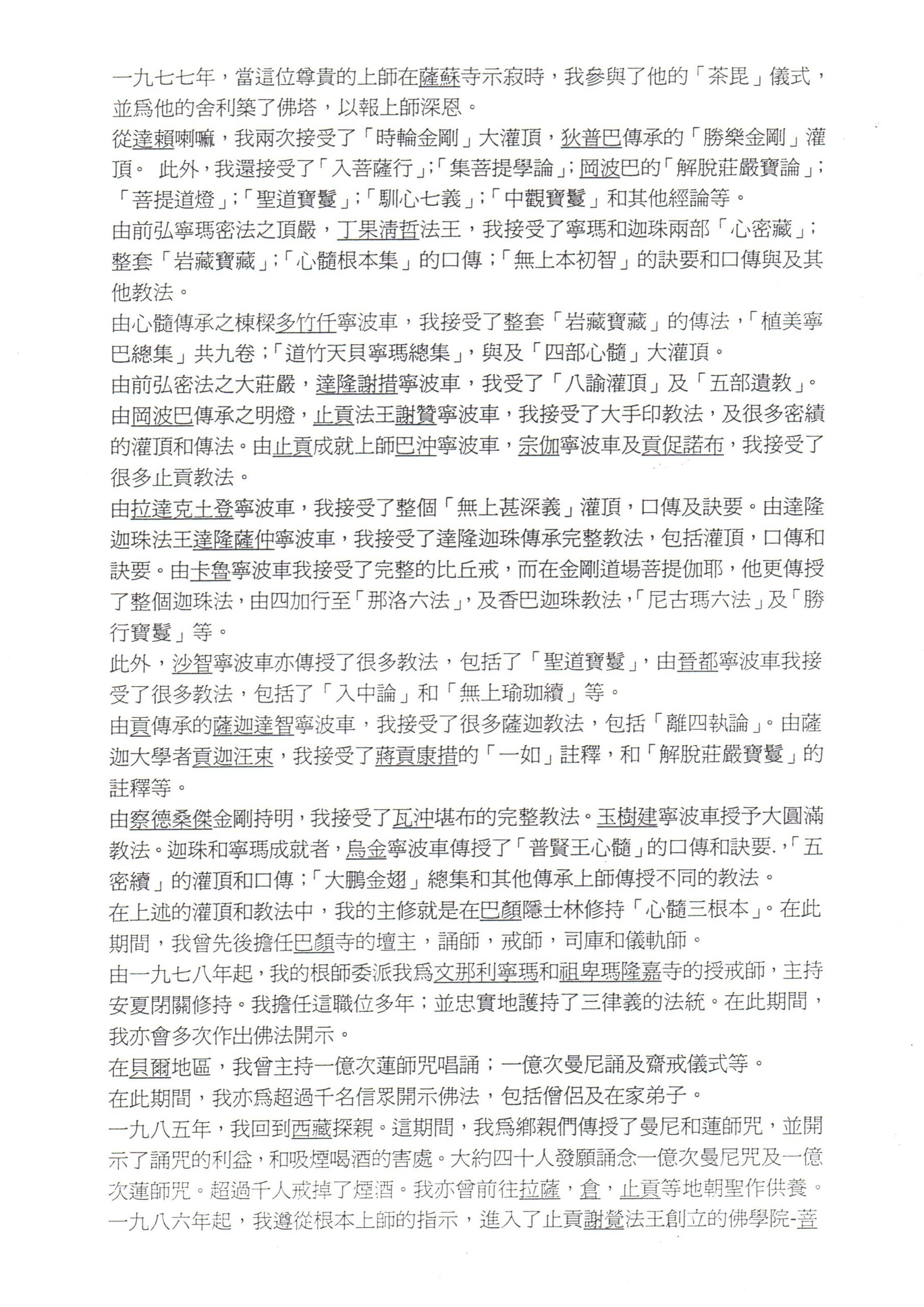 由前弘寧瑪密法之頂嚴,丁果清哲法王,我接受了寧瑪和迦珠兩部「心密藏」;整套「岩藏寶藏」;「心髓根本集」的口傳;「無上本初智」的訣要和口傳與及其他教法。
