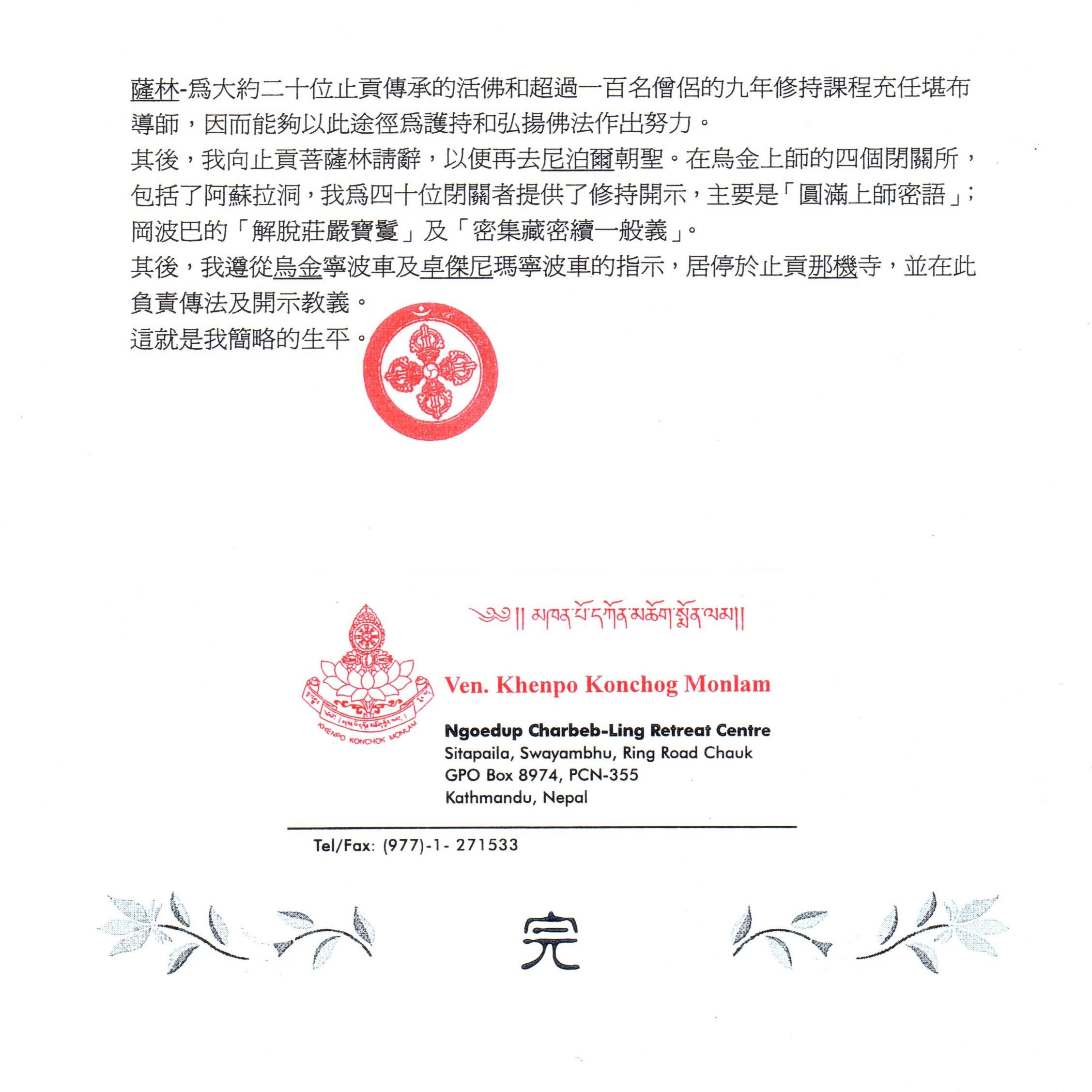 一九八六年起,我遵從根本上師的指示,進入了上賈謝螢法王創立的佛學院-菩薩林-爲大約二十位止貢傳承的活佛和超過一百名僧侶的九年修持課程充任堪布導師,因而能夠以此途徑爲護持和弘揚佛法作出努力。