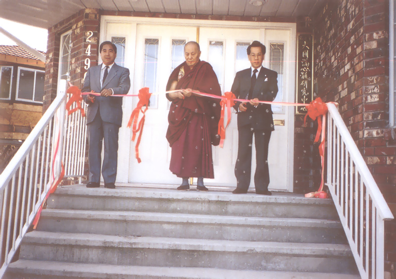 1.顯教和密教有什麼不同,你最初是當和尚為什麼去學密宗。2.密法對人生有什麼好處。3.密法對社會科學有什麼關係。(此三問題將在文庫第九輯出版),上師將此三個問題作圓滿解答。結束當天有許多人皈依,這是上師第一次到溫哥華宏法,到一九九O年溫哥華信衆要求上師到溫市來傳破瓦法,上師為滿足大家之心願,於九O年十一月初抵溫,到廿五日開始灌頂傳破瓦法,當時自己沒有傳法場所,東借地方、西借地方,才把破瓦法開頂結束;因破瓦法是天天要修,可以成功須要十天左右方能圓滿,三十多人開頂,因此大家覺得自己沒有地方,上師來傳法是很不便,故大家發心捐款,籌買道場上師就回美國,這是上師第二次到溫哥華,至九一年上師就香港傳大圓滿心髓徹卻陀噶大法時,上師同弟子楊釗居士(他是香港旭日集團董事長),談及溫哥華成立道場宏法時,楊居士一口應承為溫哥華買屋。因楊居士溫哥華有事業,所以一切由溫哥華付款請律師專業辦好後移交給上師簽字。我本人亦是上師在港時收的弟子,同楊釗都是師兄弟,我在港時同玄行法師亦學過風水,所以這次上師買的屋我亦看過分金的,認為不錯才買下來。到一九九一年八月中旬上師第三次抵溫哥華,已有自己下腳地方。故上師到溫市後,休息數日,便於九月廿一日舉行落成剪彩典禮(見圖),同時傳咕薩哩施身法;上師又傳般若定祈請頌消障法,九接佛風魔崇部多煙供法,每星期帶領大家共修,每月初十、廿五日帶大家會供,大家在半個月內犯了三昧耶戒的懺除清淨,現在上師每年要跑三個中心,香港、美國、溫哥華,這就是上師在溫哥華成立道場的經過。